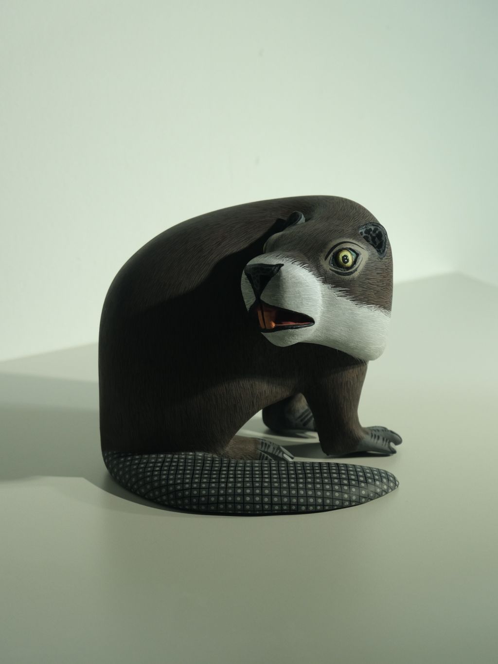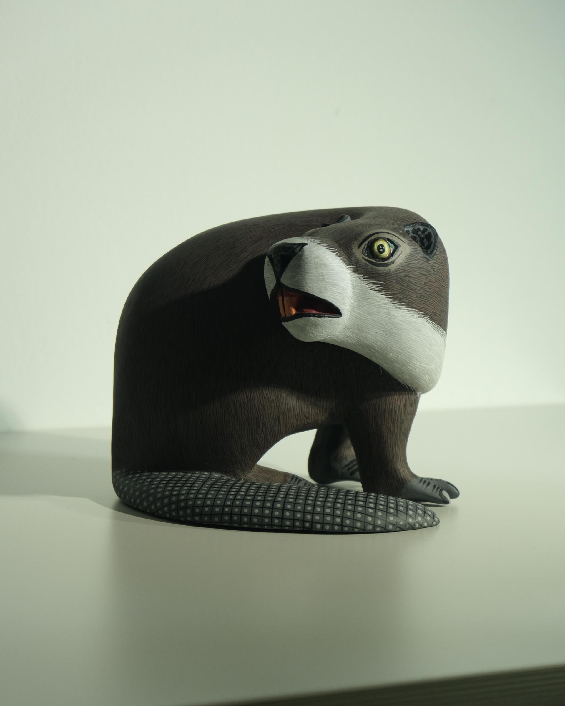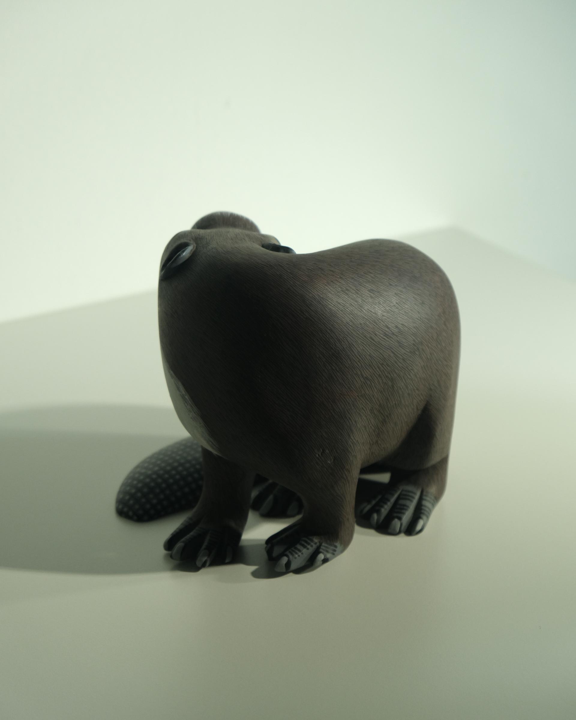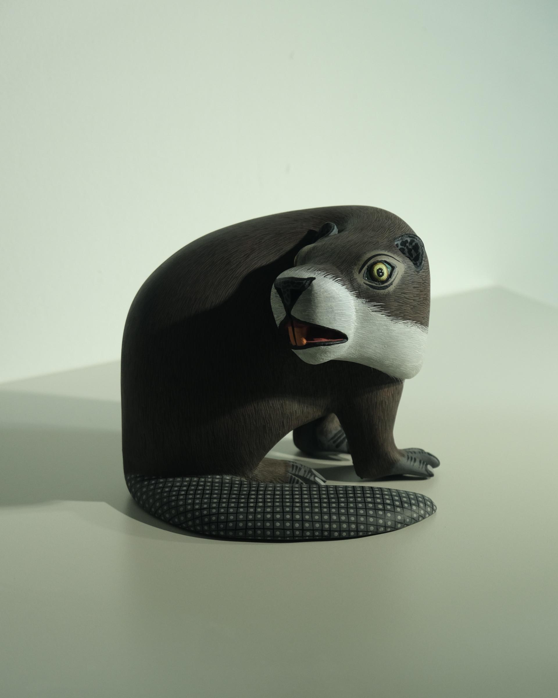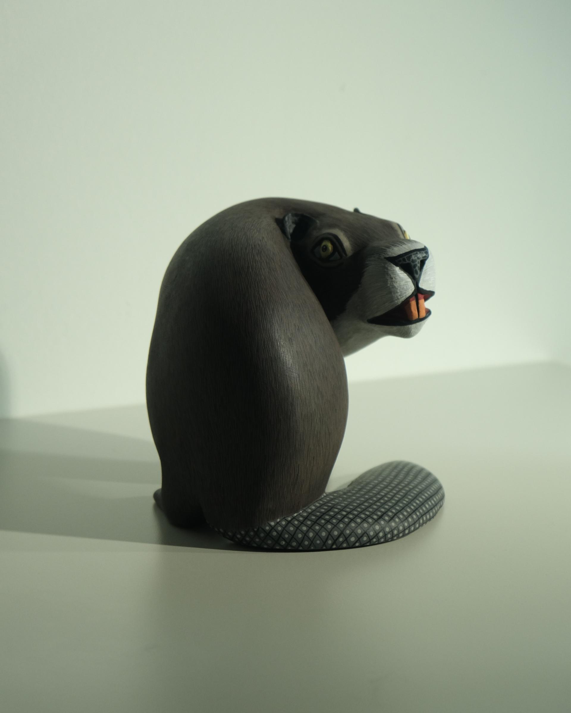 비버를 조각한 작품으로 멕시코산 코펄나무를 마체테와 조각칼 을 사용해 조각하고 평평한 질감과 디테일 표현을 위해 석고한겹 입혀진 작품입니다.