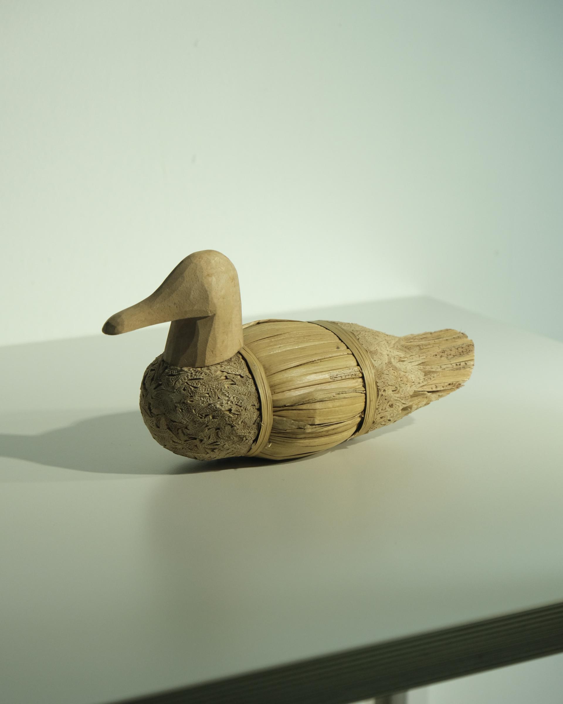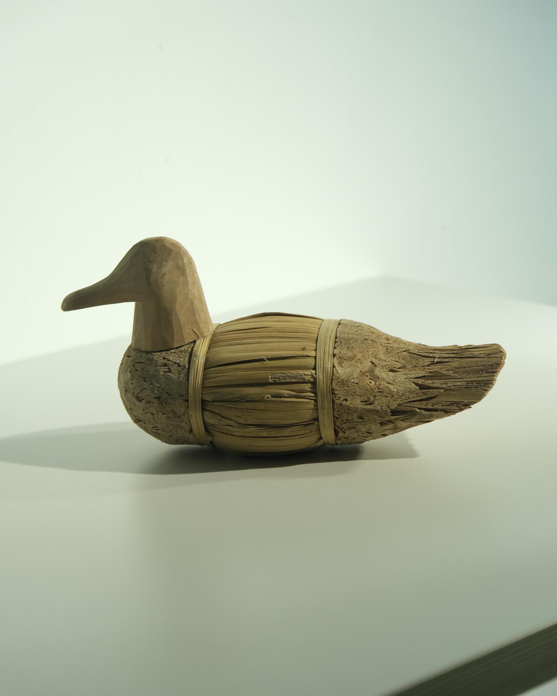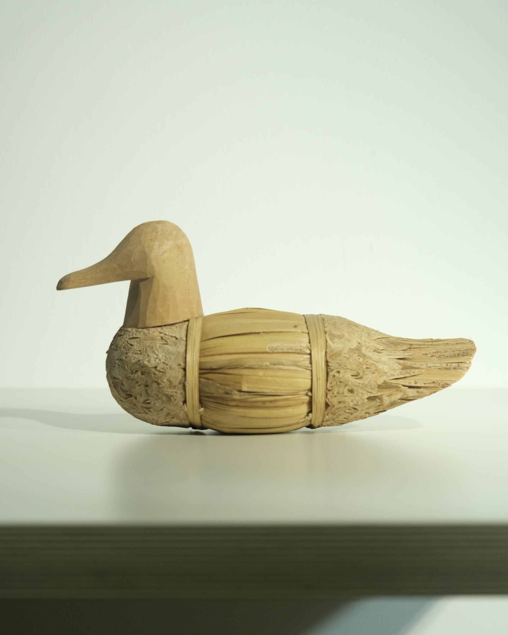 나무와 짚으로 조합된 빈티지 오리 조형물입니다.